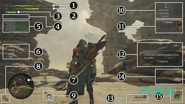 6是导虫通知,告诉大家周围可以采集什么,7是小地图,8是环境示警,告诉我们天气跟时间段的,9则是告诉我们当前目标怪物是什么。10是操作指南,告诉我们当前武器能用什么操作。11则是任务目标,我们当前需要做的事情。