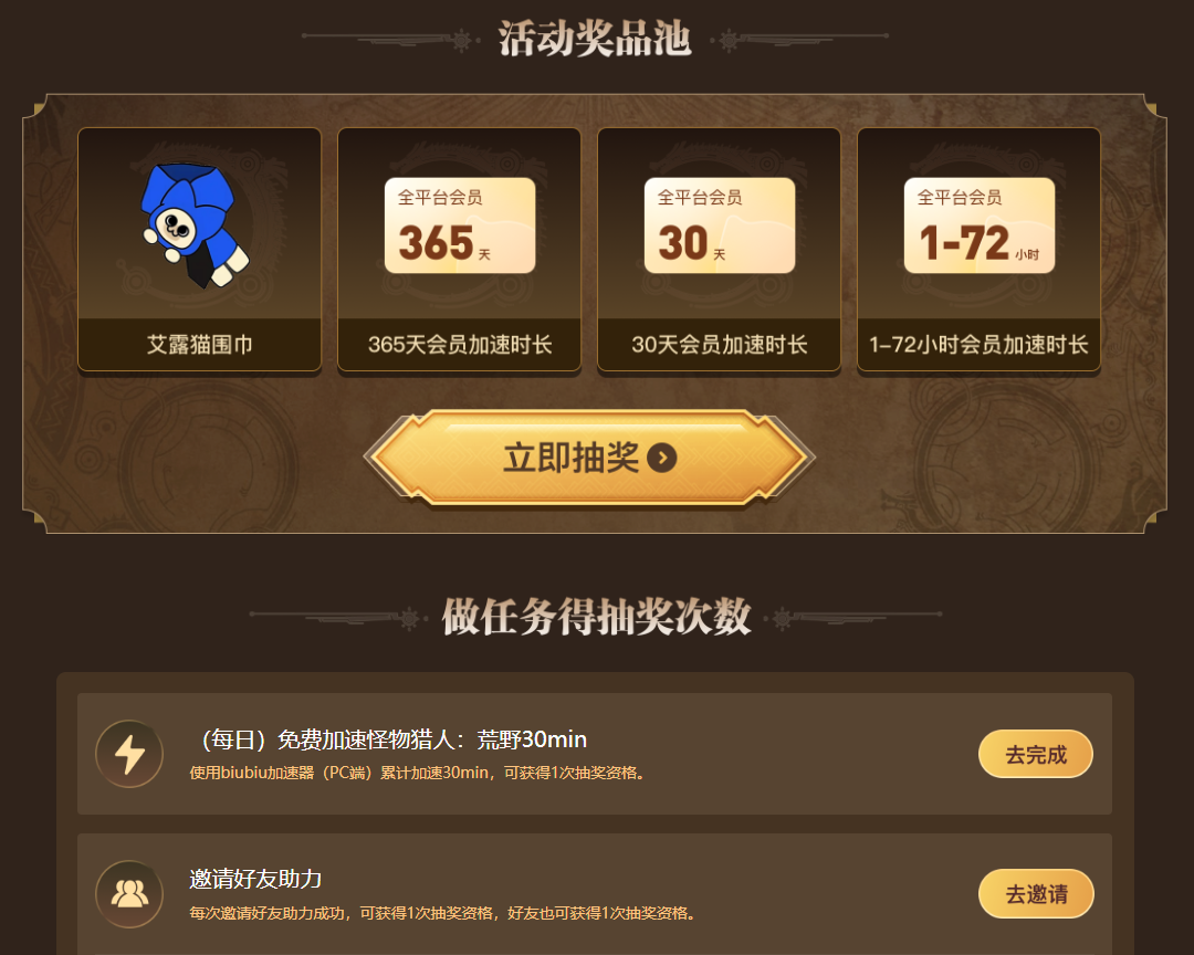 但是有帮手能给大家助力,那就是biubiu了,稳定网络之后让我们不炸房,打怪也就顺利了。现在活动超棒的,2.7-17日内,我们享受的怪猎加速是免费的,使用到30分钟后能拿到抽奖机会,邀请好友再多一次,奖品丰富,有游戏本体,biubiu365天,30天,1-72小时不等的会员卡,记住每天0点重置次数的,积极获取吧。
