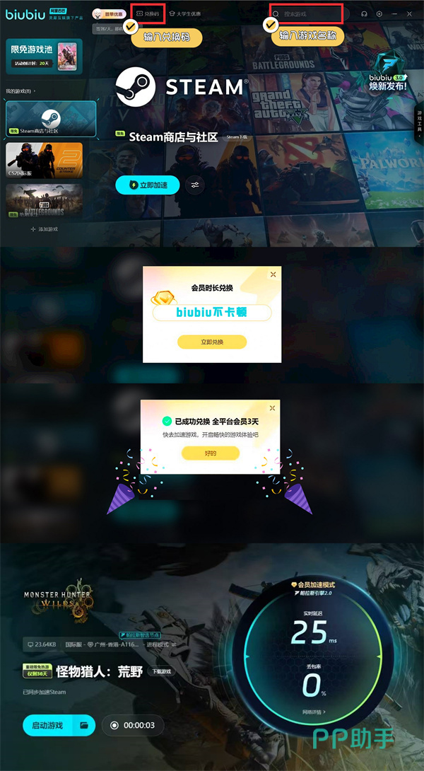 若是希望能解锁更多加速福利也是可以的,现在所有的平台用户都可去点击界面中的兑换按钮,然后输入【biubiu不卡顿】,如此就能拿到72H加速机会,助力各位去长时间体验游戏,而不用在担心会遇到卡顿等方面的问题。