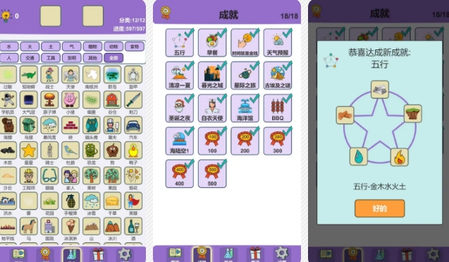 简单的炼金术是一款充满创意的合成类休闲游戏,能让玩家体验到创造万物的奇妙乐趣,游戏开场,你会拥有土水空气火这四种基础元素,玩法很简单,只需将这些元素两两组合,就能创造全新元素,随着合成不断推进,更多新奇元素逐渐解锁,从植物、动物到各类神奇物质,应有尽有,元素种类多达600+。