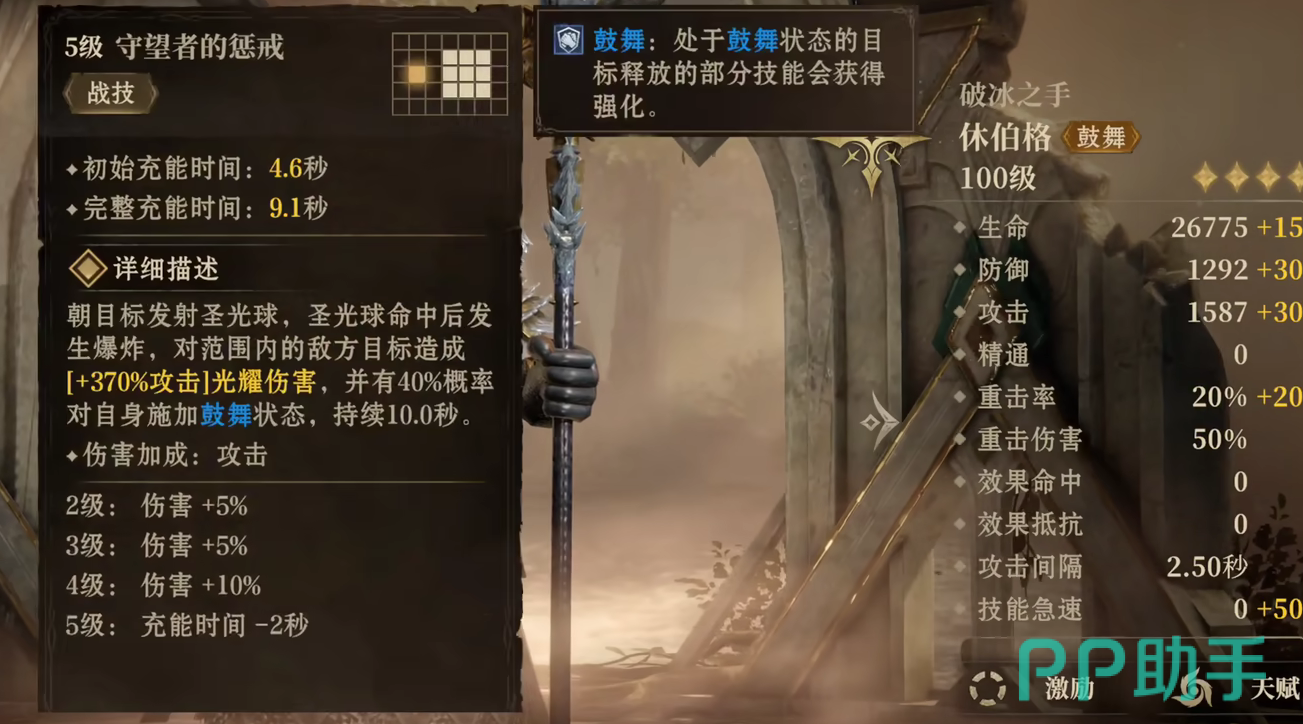 休伯格的大招技能为鼓舞技能,名为守望者的惩戒,拥有4.6秒的充能时间,在完全充能完毕后,他可以向前方是发圣光球技能,圣光球可以造成aoe伤害,从而触发370%的攻击数值,光耀伤害可以侵蚀暗属性角色,对暗属性敌人有着极大的克制效果。