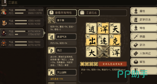 第三个的话,玩家可以选择出手式、白猿惭剑、玲珑指和好主人,在一起使用的话,不仅能够解锁神招乍现白猿惭剑,而且对于一些执法修炼的玩家来说,使用玲珑指可以直接将质粒提升10点,在队友当中如果有大黄的话,通过好主人则可以提升大黄50%的几率助攻。如果你是剑法爱好者,还可以使用一通百通以及狂风浪潮,这两大特性的加持让你可以直提升剑伤伤害和攻击率以及暴击率,对于学习特殊武学者还可以提升20%的伤害,整体加持还是非常可观的。