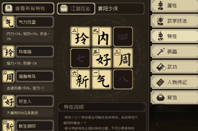目前第一个比较推荐的是童身功和浑行无穷这两个特性作为组合,这两个特性组合完成后可以形成同生无忌,白首太玄这一全新的特性,而这一特性则可以使攻击力和轻功属性提升10%,在移动方面可增加一,负面效果玩家可以直接忽略不计,对角色自身的表现并不会产生非常大的影响。