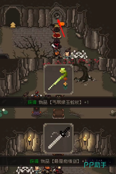 在钟南山的位置是上右侧的密室需要玩家进入密室门上有一个太极图,小编在途中进行了箭头标明,玩家在进入到密室当中就可以直接拿到丐帮的圣物绿玉蛇杖和最是痴情剑。