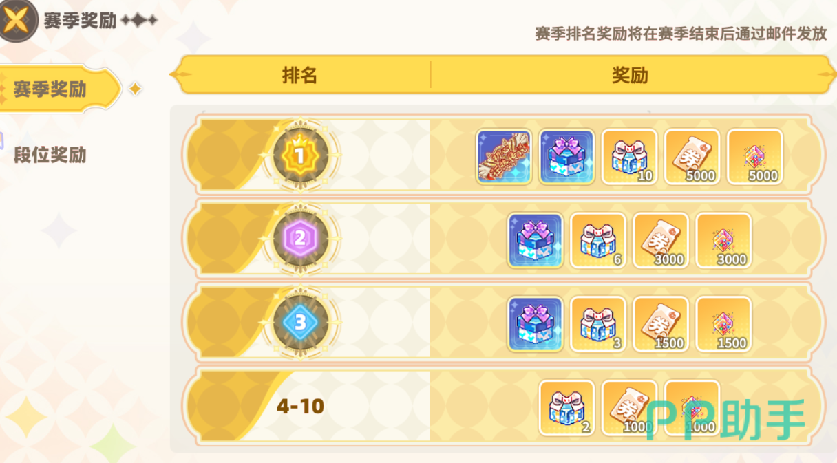 每个赛季会结算排名,排名越高拿到的奖励越多,当然要有一定的积分打底才能进到这个排行榜里,最少得有800积分。其中排名在第一的人可以获得一个限定称号。
