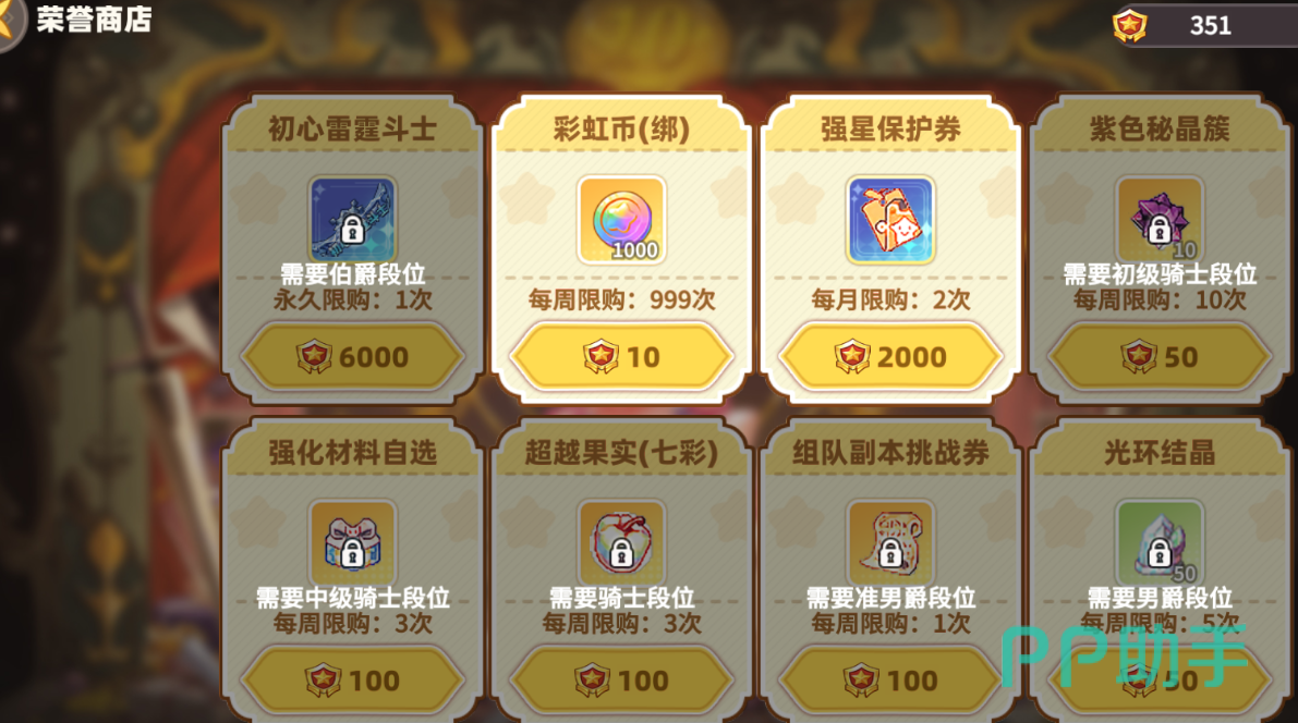 还有竞技场商店,也叫荣誉商店,能在里面兑换一些限定的奖励,比较值钱的有绑定彩虹币和强星保护券。值得一提的是,彩虹橙PVP玩法里还会对玩家人物属性进行一些平衡,避免影响玩家的体验。
