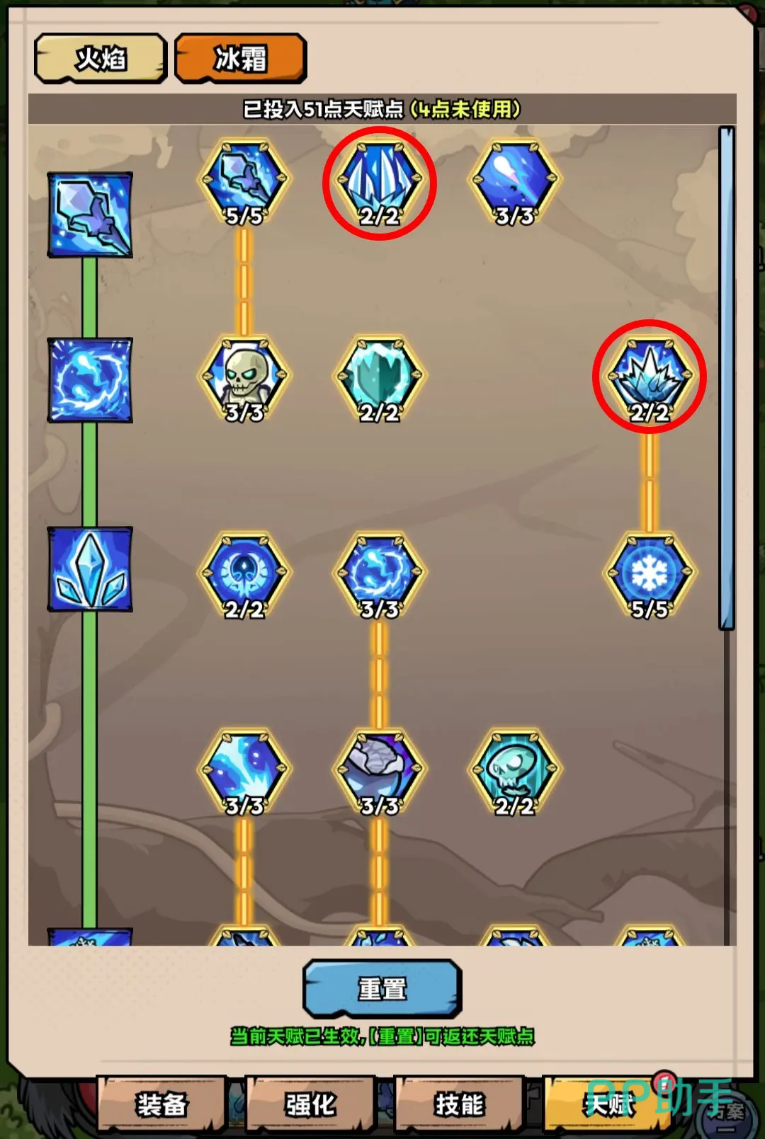 在技能的加点方面,“奥数智慧”,“熔岩铠甲”,“暴风雪”,“冰锥术”,“魔爆术”,“冰霜新星”,“火焰冲击”,“寒冰箭”,“冰风暴”都推荐去加点使用,根据蓝量的情况,也可以选择“霜冻护体”加入到技能循环的序列当中,这样能减少失误的消耗。