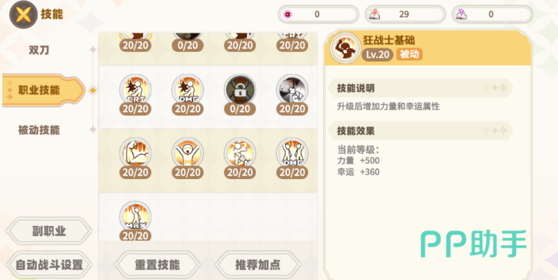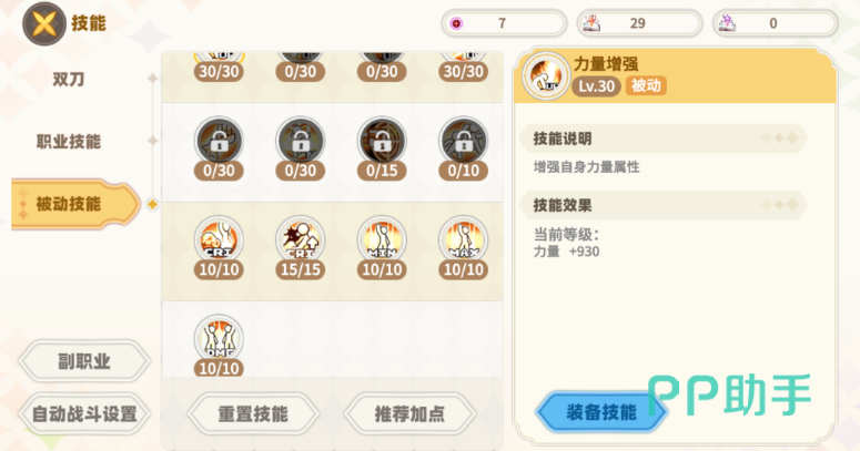 被动技能方面,优先提升大小攻击和背击,然后是暴击暴伤。技能点多时,力量和幸运可以均匀点满;如果技能点较少,先点力量增强和幸运增强,其他的可以暂时不点。