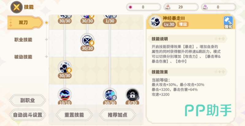 若技能书较多,优先点觉醒和暴走(15-10-3),接着是大风车、凌波斩和狂风刺,按顺序逐个点满即可。技能书充足时,可以实现大风车的无限循环,并且在空档期补充凌波剑气以提升输出效率。