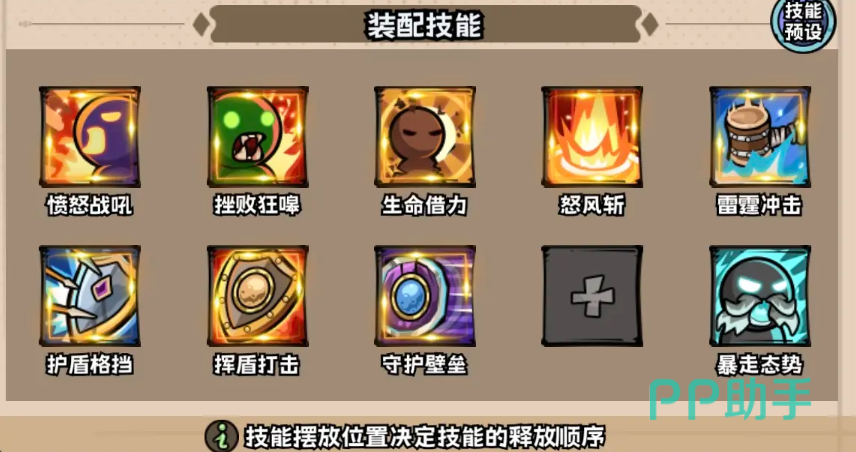 愤怒战吼、挫败狂嚎、生命借力、怒风斩、雷霆冲击、护盾格挡、挥盾打击、守护壁垒、暴走态势。这几个技能是比较推荐装配的,而且顺序就是按照上面写的顺序来。
