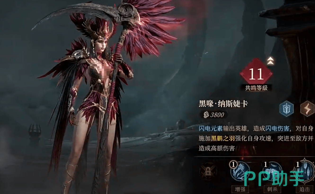 她拥有极强的单点破坏能力,是无畏流派的核心输出英雄,能直接突袭生命最低的敌人还能协同队友来发动攻击,队友的普攻频率越快越能为其带来更高的输出上限,她的被动会让自身每存活一段时间,就获得1层持续时长无限且不能被移除的黑鹳状态,并且自身会根据攻速来获得额外的重击率,她的技能会位移到目前场上最低生命值目标身边并造成3次闪电伤害,她的威能技会对一个范围内敌人形成一定闪电伤害,随后当我方的成员对任意目标发动普攻时,自身都有一定概率可以使用羽毛,再追加一次攻击,如果是无畏类目标的话,则有双倍概率触发。