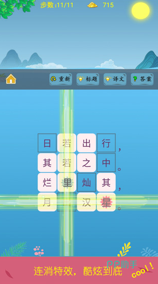 在这里,玩家不仅能沉浸在诗词文化的深邃魅力,还能邀请好友共赴一场穿梭于诗意天地间的奇妙旅程。玩家需从杂乱的字符中拼凑出完整的诗句,这一过程既考验智慧,也充满挑战,让思维敏捷者乐在其中,同时也为诗词爱好者提供了一片试炼场。随着游戏进程的推进,关卡难度循序渐进,逐渐的攀升。玩家只需简单操作,交换诗句中的文字,就能在享受游戏乐趣的同时,不知不觉间增进对古诗词的理解与鉴赏能力。