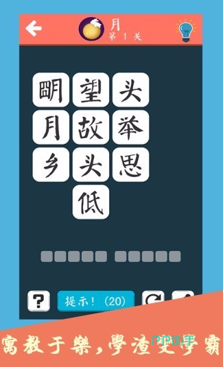一款结合了多样解谜元素的文字游戏,巧妙融入问答和历史人物知识,让玩家在体验游戏乐趣的同时,也能收获丰富的知识养分。玩家需从字库中精选字词,依据给出的诗词片段,拼凑出完整的诗句。游戏通过多样化的互动设计,增强了玩家的参与感与乐趣,玩家间可分享心得,实现知识与乐趣的双重收获。以细腻的画面与柔和的背景音乐,构建了一个诗意盎然的游戏空间,让玩家仿佛穿越至古代诗人的诗意世界。