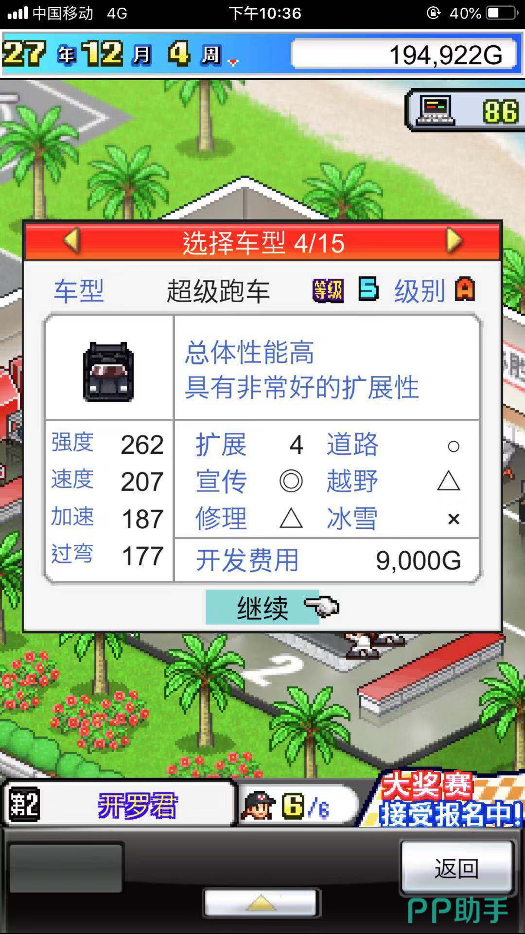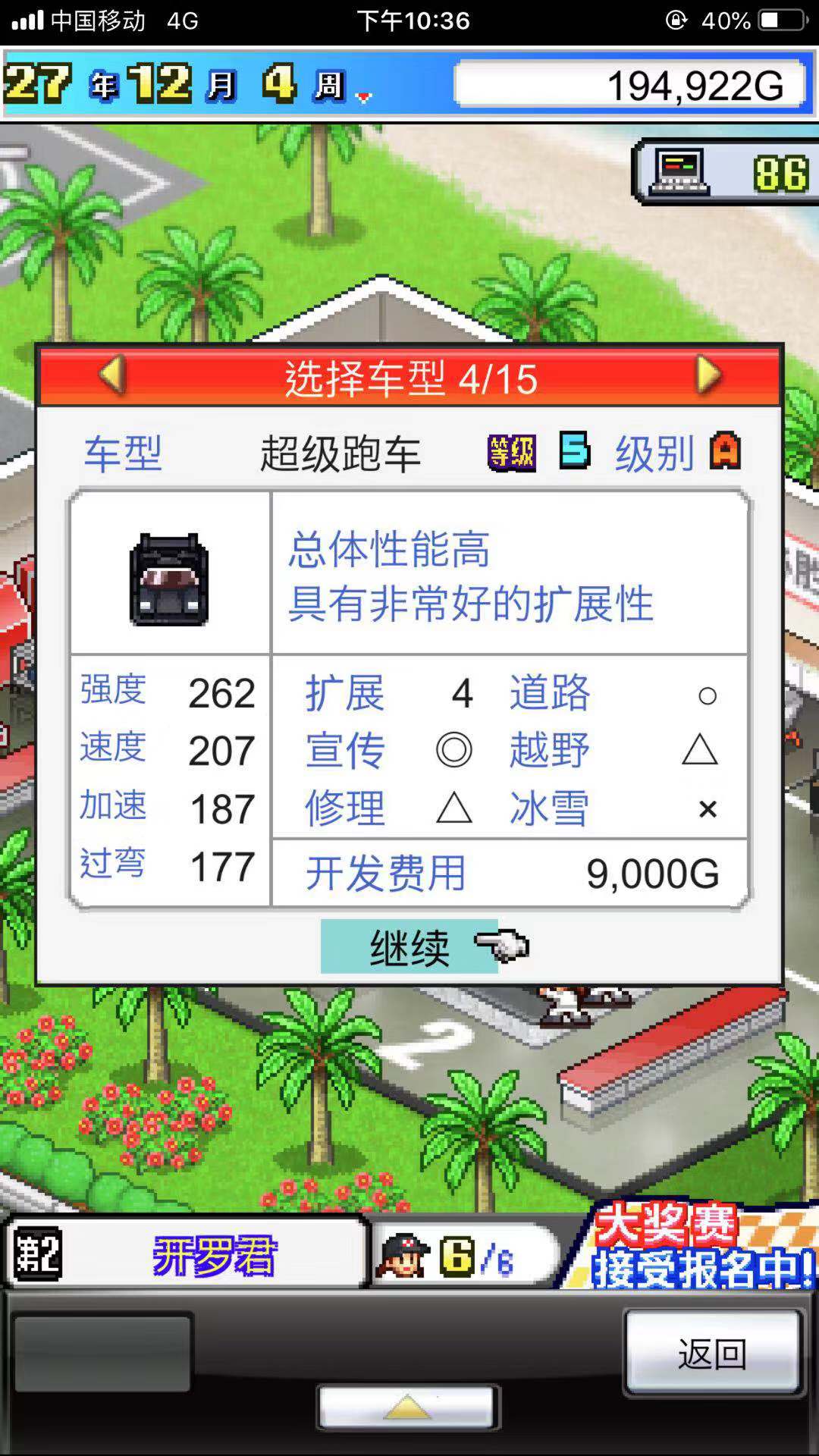 第三步:原型车可以用来跑第二个大奖赛,一定要把团队的技术能力提升上去,不然是无法开发原型车的,技术能力远远低于该车型的话整个开发过程赛车的属性会保持不变。接着把原型车改良率达到百分之50出现超级跑车。