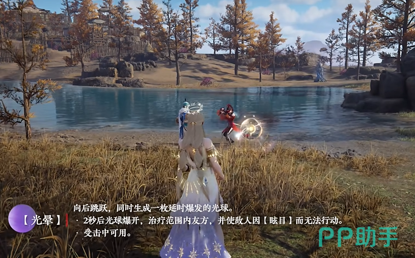 光晕是一个兼具防御与进攻的受击技能,在战斗中使用技能后会如敏捷的灵狐般向后跳跃,与此同时,一枚散发着神秘光芒的延时爆发光球悄然生成,2秒后光球轰然爆开,绽放出的光芒不仅能为范围内的友方英雄恢复生命值,技能非常实用,在后跳躲避伤害的同时,用爆开的光球打断敌人进攻节奏,为己方创造反击机会 ,光晕・瞬附在选定的目标地点生成一枚光球,光球爆炸后,同样能治疗己方队友并对敌人造成一定的控制效果,为队友回血的同时,在关键时刻爆炸眩晕敌人,帮助队友脱离危险。