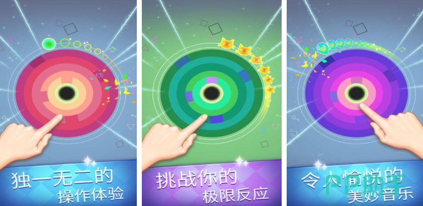 喜欢黑洞题材设定的可以尝试一下节奏黑洞挑战,这是一个在设定上完全不同的游戏,每一关都只有一个基础的场景,在黑洞周围会环绕着很多彩色的光圈,随着音乐的律动会有很多小怪兽出现在这些光圈上,玩家需要做的就是不断旋转黑洞,让这些小怪物可以沿着光圈的缺口进入黑洞,是一个非常考验反应能力和手速的游戏。