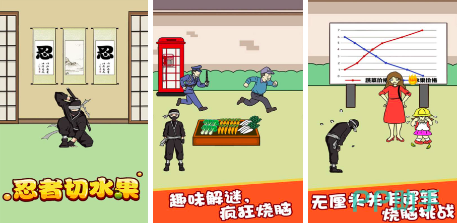 围绕着忍者主题,也创作出了很多无厘头搞笑的游戏作品,比如这款忍者切水果玩家不仅可以开启各种疯狂趣味的解密玩法,而且在游戏当中还可以开启减压模式,疯狂烧脑,而且还可以解锁很多搞笑逗趣的关卡内容,找到隐藏水果,成功将它们切碎,几十个不同的趣味型关卡配合着搞笑动漫画风,让很多小伙伴们在其中宣泄内心压力。