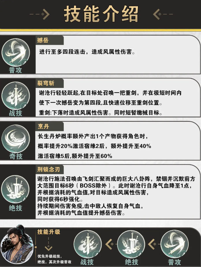 谢沧行的技能系统具有鲜明的风属性特点,尤其擅长通过快速的移位和强力的风属性攻击来给敌人造成持续性伤害。他的普攻技能非常具有特色,能够进行最多四段的连击,造成稳定的伤害。同时,他召唤重剑发动攻击时,不仅能打击敌人,还能迅速移动到敌人身边,从而利用风属性造成大量伤害。谢沧行的绝技技能是他最具代表性的技能之一。这一技能通过消耗一定的血量来提升攻击力,强化风属性伤害,并能使他在强化状态下免疫所有伤害。强化状态持续约6秒,在此期间,谢沧行可以攻击敌人来恢复自己的气血,这使得他的生存能力大大增强,同时在强化状态下,他的伤害输出也得到了显著提升。这个技能的核心优势在于它不仅能提高谢沧行的攻击力,还能通过攻击敌人来恢复自身的生命值,进而延长战斗时间。因此,在对战中,合理利用谢沧行的绝技可以帮助他在战斗中持续输出并保持较高的生存能力。