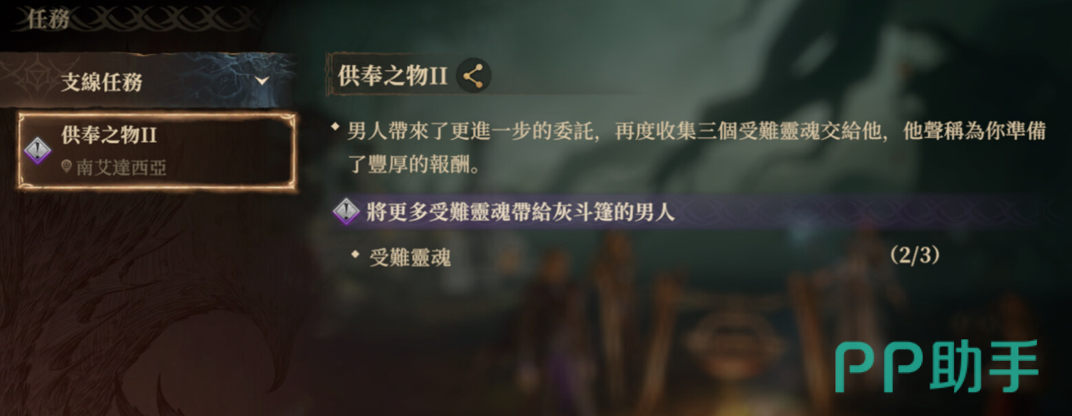 这是【供奉之物II】系列的任务,需要玩家再去收集3个受难灵魂交给NPC,相应的给玩家准备了丰厚的报酬。大多数人找到2个灵魂不是大问题,只是不知道第三个在哪里。