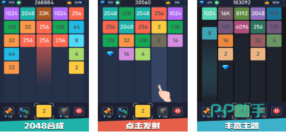 2048合成是款具有休闲性质的数字方块合并神作,点触屏幕发射方块的设定区别于经典2048玩法,多样主题背景让这款数字手游更有新鲜感,规则与操作方面无脑且上手超级容易,相同数字的方块进行触碰得分就越高,数字方块颜色各异带来了差异化视觉效果,还提供了一系列实用工具能快速合成数字,合成得分的特殊性质也带来了满足感。
