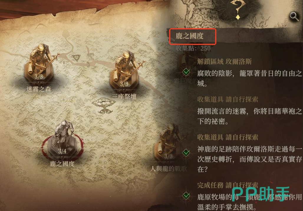 鹿之国度是游戏里的【纳瑟瑞亚】大陆的四大区域之一,另外3个区域分别是迷雾之森、三座祭坛、人与龙的战歌。每个区域都有一些任务需要完成,鹿之国度这里有四个主要任务。
