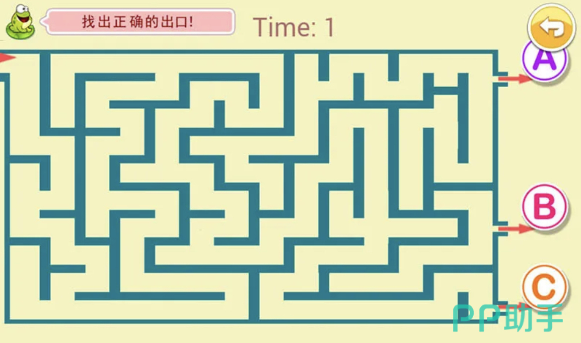 在迷宫大冒险中,儿童玩家的智力会得到慢慢增长。关卡难度较小,玩家从入口开始慢慢尝试找到出口。道具使用比较独特,儿童玩家可使用提示道具避免错误的路线,也可以使用标记道具快速进行路线排除。系统会给出 ABC3个出口,玩家只需要选择一个即可。