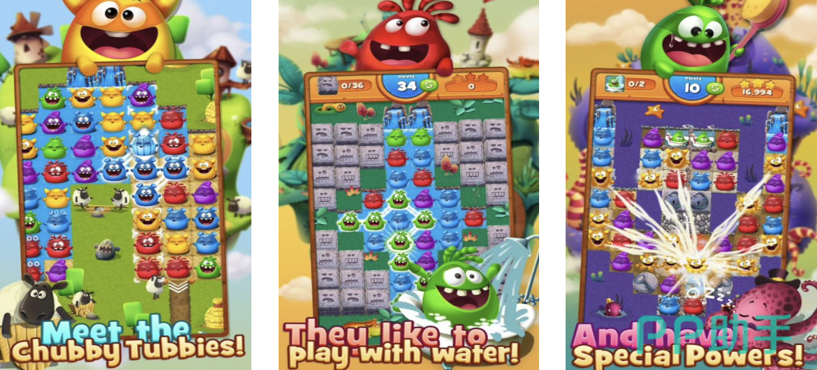 小胖的颜色较多且充满搞笑元素,非常适合儿童玩家。操作较为简单,玩家将三个及以上相同颜色的小炮连在一起即可。当小胖消除之后,该区域就会形成小水流,玩家的目的是通过重复的消除让水从上到下流通出来。某些小胖还处于石化当中,各位小朋友要加油哦。