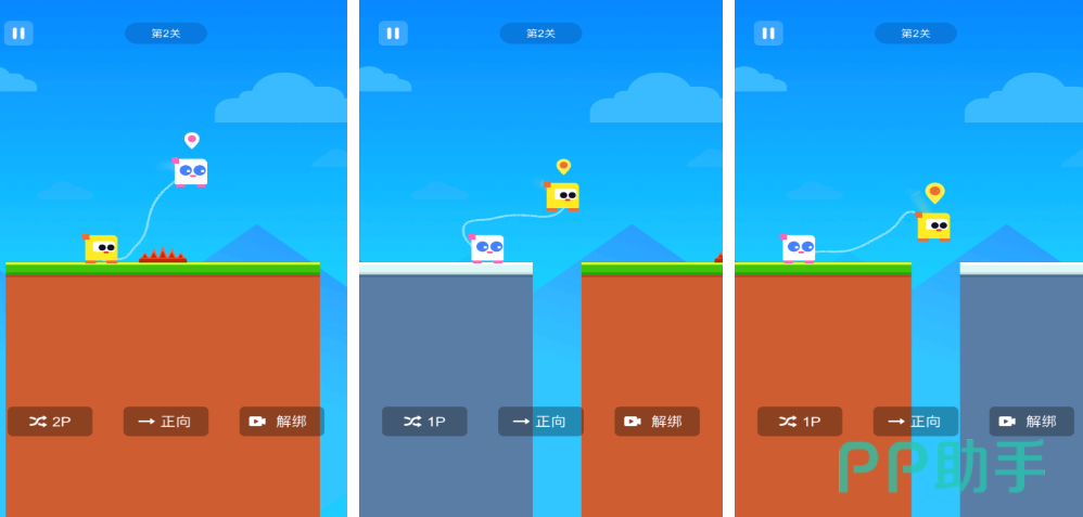 在简洁画风的页面中,两个不同形状的小人用一个绳子相连。小人的形状可以挑选,每一个小人还可以带有萌萌的大眼睛,有时候还会有海绵宝宝形状的小人哦。关卡种类较多,两个小人需要通过跳跃的方式来避开小悬崖。在跳跃难度方面,由于有绳子相连,所以两位玩家需要配合操作,并且还要等待时机。