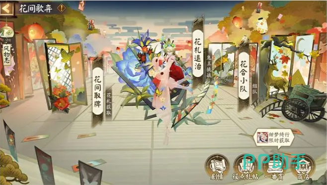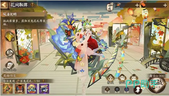 1、“花间取牌”玩法。消耗一定体力参与,挑战歌留多,有概率掉落1-6星的“百鬼花扎”,获得高星的概率随着大家获得百鬼花札数量的增多而提升,在这能自选御魂或者觉醒材料。