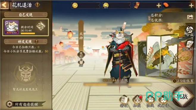 2、“花札退治”,可使用1-6星的百鬼花札召唤对应星级的随机花札鬼王进行挑战,在限定时间内战胜鬼王后获得“文点币”,可用于在未来小铺中兑换奖励,可邀请好友或者是寮友进行助战,协助好友或寮友击败鬼王也能获得奖励,在该战斗中,可借助式神协助作战,每日次数上限和活动开始时大家拥有的六星式神数量有关。