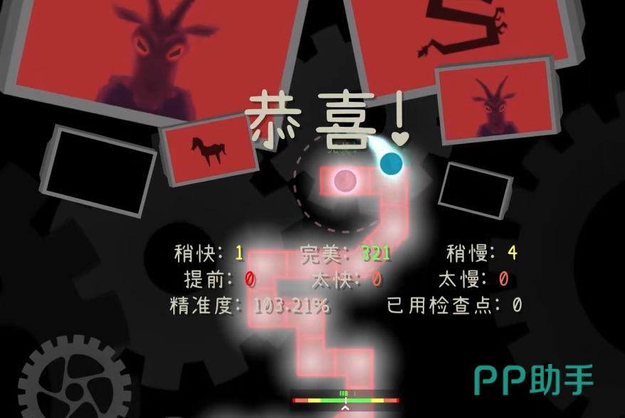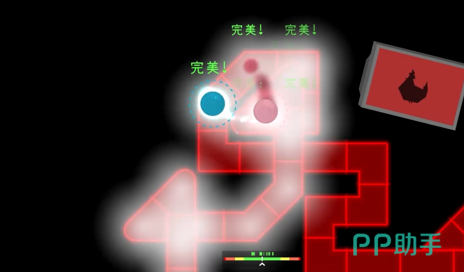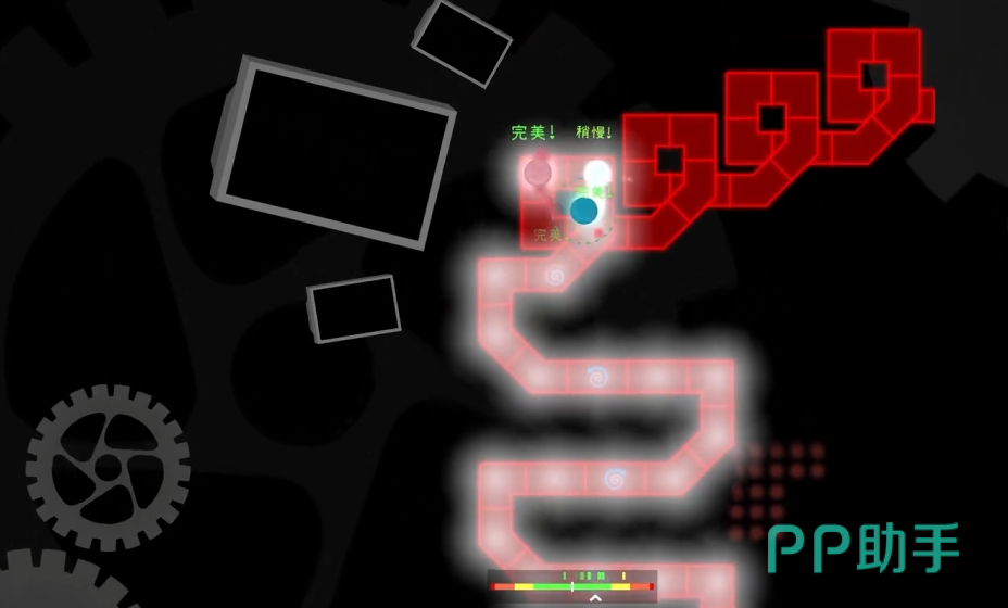 人造战车关卡的一开始就是难度很高的两个S型弯,所以在开始之前建议大家先预演一遍,以防出现心里没有预期而导致的脱出轨迹问题,同时可以将小球的速度放慢,保证判定的精准和高得分。完成这一条路径后,会进入四个连续的正方形轨迹,这里的节奏也并不算快,稍稍注意就能通过,需要注意的是接下来的一个三角形弯道,因为更换轨迹的问题所以接下来这个弯道会以绿色描边的形象出现,不要漏打,但值得庆幸的是这一部分的鼓点清晰,且速度较慢。