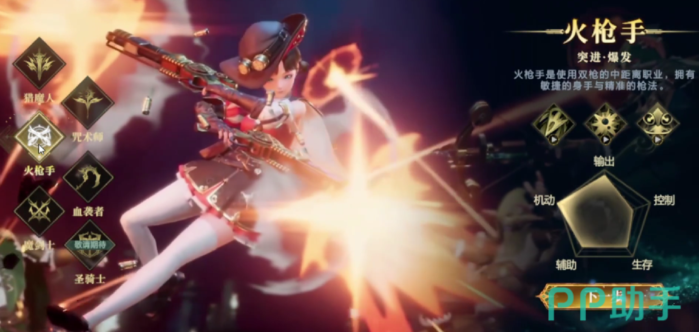 玩家在中距离作战的话,可以选择火枪手,因为他特别擅长火力压制,他的技能一旦施展之后,在短时间内就能够给敌人造成大量的伤害。其实他这个职业在游戏当中灵活性特别的强,可以找到最佳的输出位置,对于平民玩家来说是特别合适的。
