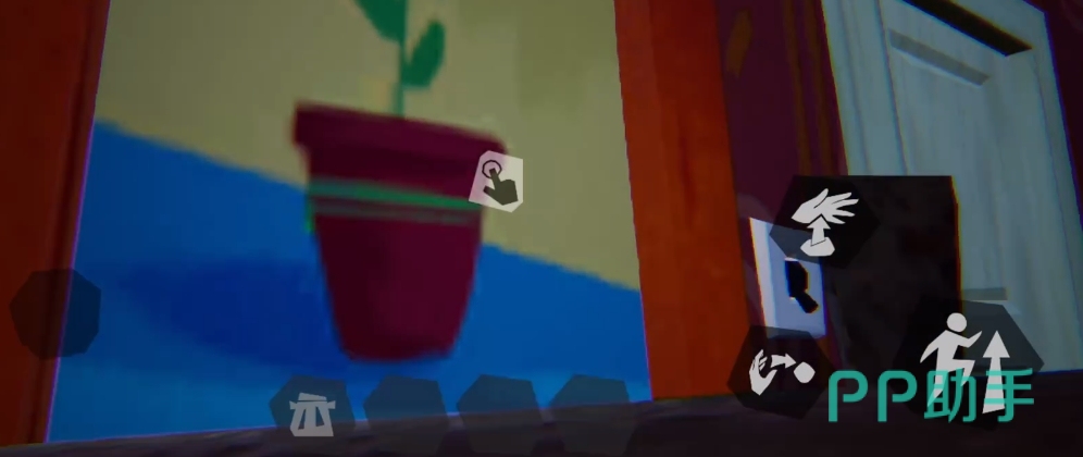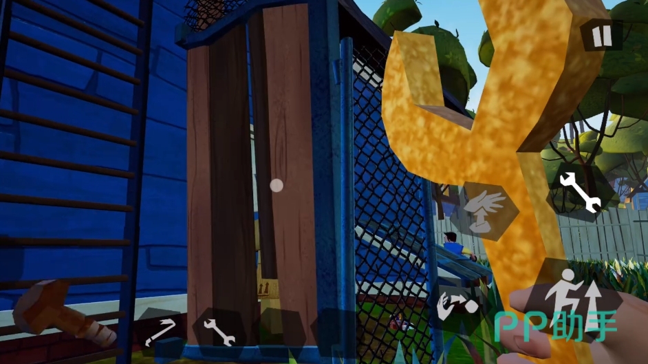 虽然吸引邻居先生离开了,但是房子是每个出口都是封闭的,所以还需要借助邻居先生园子里的杂物来打破窗户后成功进入。