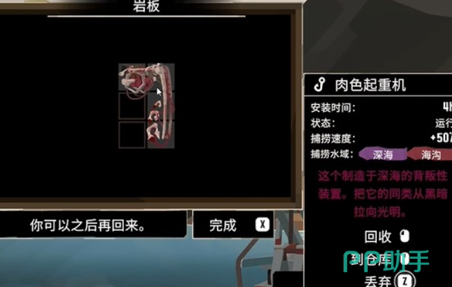 第二个石碑在蜿蜒海岸,这个石碑的难度会比较低一些,只要放置一条变异鱼就可以,但是变异鱼获得起来是有难度的,需要在钓鱼的时候仔细观察水面,如果出现了彩色的雾气,那就代表这条鱼有可能已经受到了畸变,把鱼放进去之后就能获得钢腱鱼竿。