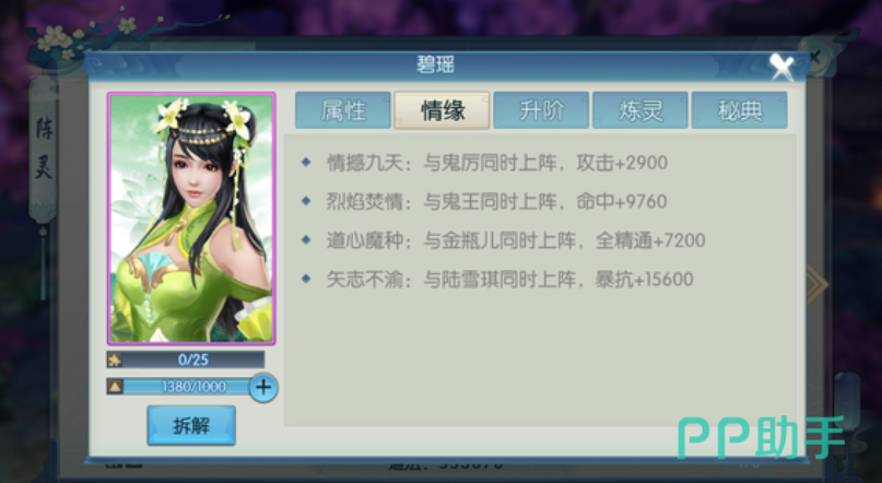 在体验游戏的时候,玩家如果组队,碧瑶其实能够跟其他的角色搭配,这样能够发挥较大的威力,如果玩家将碧瑶跟鬼厉同时上阵,这时候他的攻击性就会增强。其实碧瑶这个角色在情缘属性当中属于一大特色,简单来说就是玩家可以利用碧瑶这个角色,跟其他的角色建立情缘,这样的话,能够获得额外的属性加成。这里的情缘不仅仅是痴情,也有可能是父女情缘。