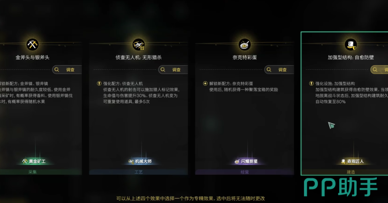 雪国人生当中的模因专精有很多类别,它们分别代表着采集、工艺、建筑,但最值得玩家在前期就点亮的是微光存续这一个模因,它可以增强玩家大火炉的等级,并且还附带有贴身空调功能,在雪地进行移动时,是非常适合玩家进行替换的模因。