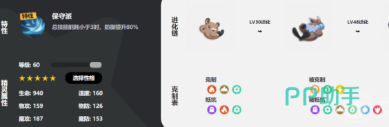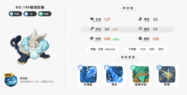 卷胡巨獭的特性“保守派”也是其一大亮点。该特性可以在使用能量消耗小于3的技能时,提升80%的防御力,使得它在低消耗技能的情况下可以更好地承受敌人的攻击。这意味着,在战斗中,卷胡巨獭能够通过合理的技能选择,提高自身的生存能力,增强其作为主力防守精灵的作用。无论是在PVE还是PVP中,这个特性都能帮助它稳定输出并承受更多伤害,是它作为防御型宠物的核心优势。