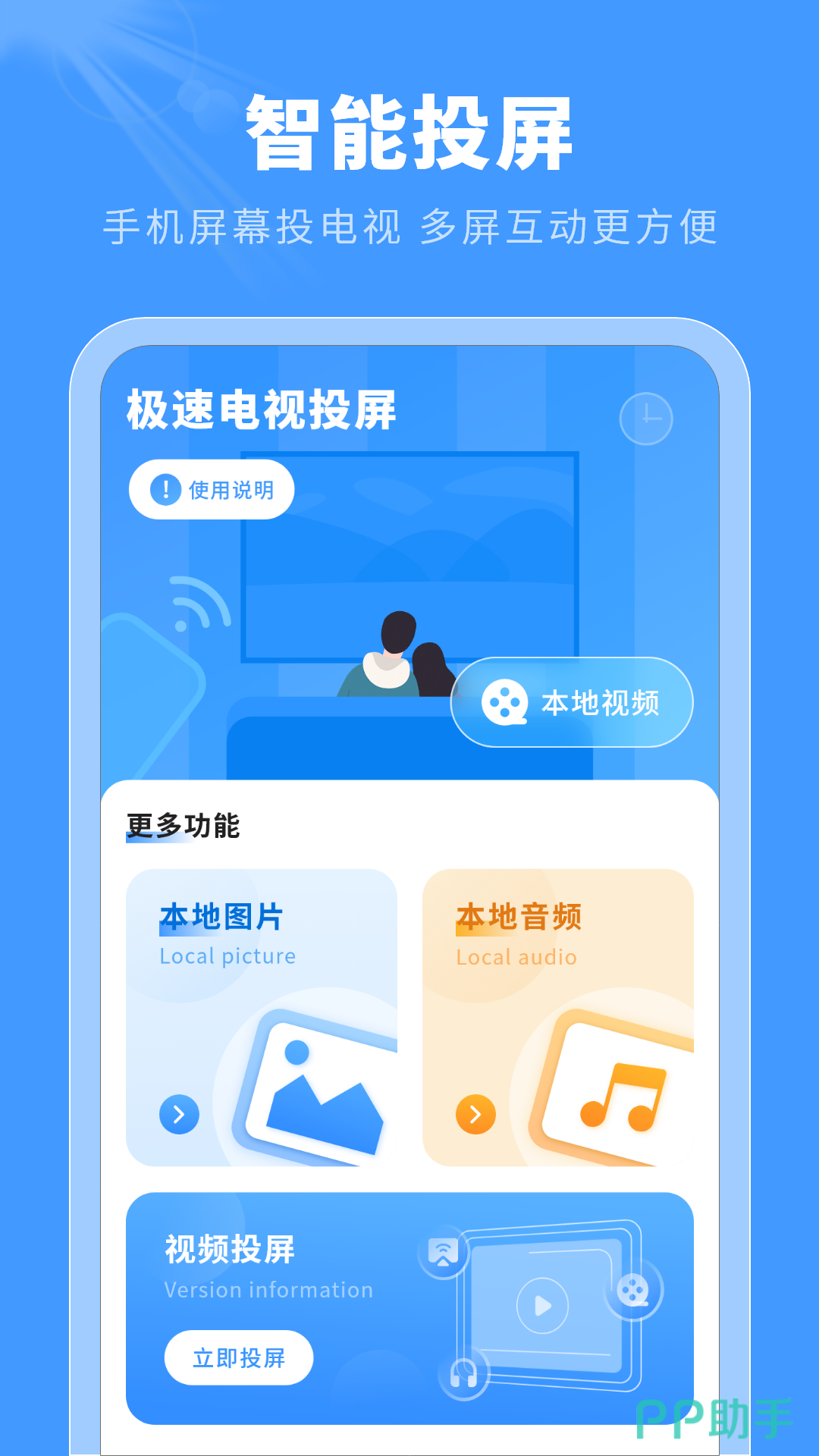 采用自动搜索的模式进行设计,只要在同一无线网络中所连接的所有智能设备,包括机顶盒等都能快速识别出来。只要连接上之后,将本地这些格式的资源视频、图片都能直接投到大屏幕中,享受更好的观看体验。电视中无需安装应用,只要连接上就能一键操作。