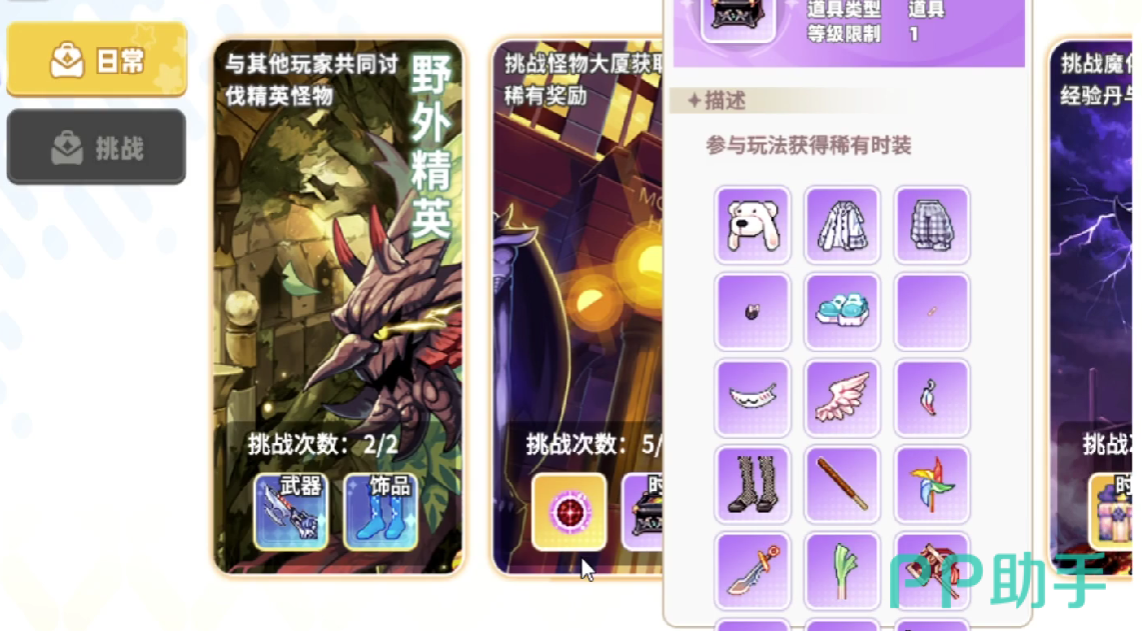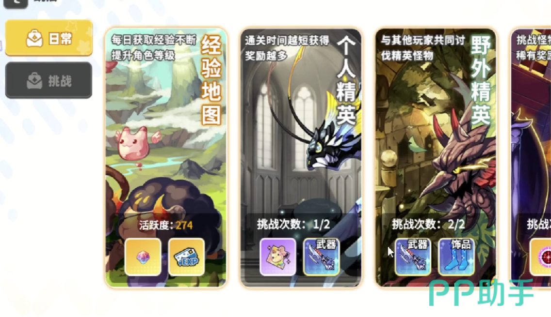 第三个需要玩家注重的地方是挑战任务的完成,当玩家打开所有任务面板时,找到挑战这一栏,即可从经验地图抑或是从大世界挑战内,获得武器装备亦或是蓝图碎片.