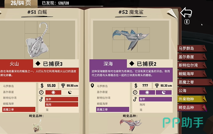 渔帆暗涌魔鬼鲨怎么获取的内容小编就介绍到这里了,游戏的核心玩法是捕鱼卖钱,再用钱升级船体,探索更深海域,游戏内有24小时的时间系统,6点到18点是白天,18点到6点为黑夜,白天玩家外出活动,比如钓鱼、打捞、做任务等,夜晚则回码头休息,完成卖鱼、睡觉、升级科技、修复船体等操作,切换昼夜时,全局刷新钓点,且昼夜钓点不同,每个位置鱼数量有限,钓完钓点消失,随时间重置,感兴趣的玩家可以尝试一下。