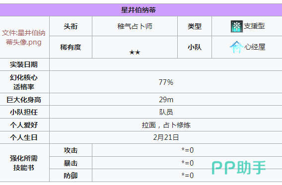 星井伯纳蒂:是一个二星级的角色,爱好是拉面以及占卜修炼。在战斗的过程中,自视技能就可以将自身作为支援目标。知性代理理性技能在目标生命值超过50%之后,就可以有效获得20%的攻击力,并且在9个回合内都有作用。