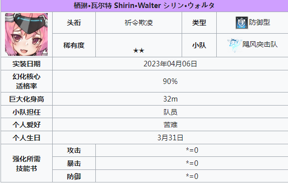 栖琳 瓦尔特:从技能方面来看,是一个特色比较鲜明的攻击型角色,栖止 - 不屈之志技能在使用之后就可以有效带来不屈的技能,并且在12个回合内都有效果。一旦在受到普通攻击之后,就可以恢复自身11%的最大生命值。