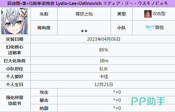 莉迪娅 李 乌斯季诺维奇:是一个攻击型的角色,远点射击在完成普通攻击之后,就可以针对目标形成90%的攻击力伤害。永劫子弹在攻击之前就可以提升自身20%的攻击力,并且在持续18个回合内都有效果。这一个角色主要擅长的是在雪地中作战,在战场上不仅会有强大的火力,同样也可以冷静的去分析所有的情报。
