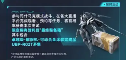 首先,让我们快速过一遍活动的几大亮点。最重要的莫过于“最终整备箱”,这是一次不容错过的限时奖励!参与玛什马克模式的战斗,就有机会从箱子里获得各种战利品,甚至可以拿到我们梦寐以求的1:72矛隼模型【卓越级·解限机·可动合金涂装UBP-R02T矛隼模型兑换凭证】。这不只是一个模型,而是代表着你在这次“全球风暴”测试中的英勇表现。另外,记得在Steam上添加《解限机》到愿望单!这样你不仅能抢先了解更多游戏信息,还能获得限时的“薪火纪念”棒球帽。说到这件饰品,你可别小看它,正式公测后你依然能将它带到游戏中,绝对是一个显摆实力的利器!