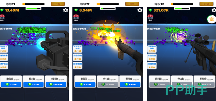 打枪我贼溜可以帮助玩家训练枪法,一些玩家进入到射击游戏之后,就会发现自己的枪法太烂,这款游戏通过简单的模式也能得到射击准确度锻炼,游戏里玩家遇到的对手都不再是各种怪物,而是一个个的像素方块,需要在短时间内快速射击方块获得收益,后期还可以用这些收益购买其他的枪械,新手可以先借助这个游戏来锻炼一下射击精准度。