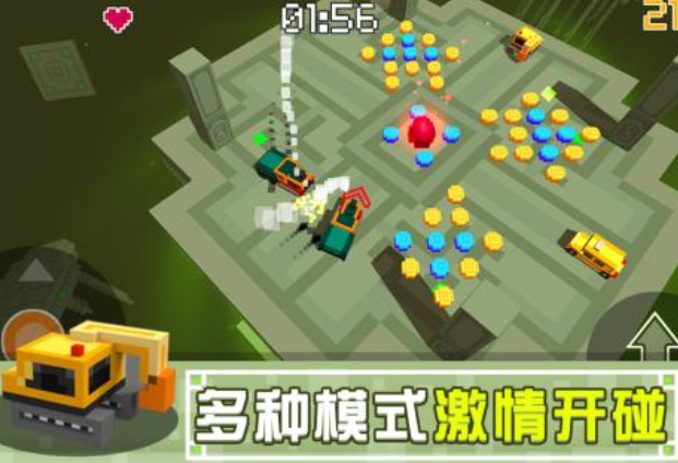 在像素画风中,玩家操控小车进行碰撞。车的类型非常丰富,辣椒人和蜡笔毛毛虫等多种型号的车供玩家选择。在配件方面,玩家可为不同类型的车更换不同的轮胎。碰撞技巧比较简单,玩家锁定目标小车后就可以以最高速度相撞。在特殊关卡中,玩家还可以收集宝石,乱斗的过程中,拣取道具可以有更大的赢面哦。