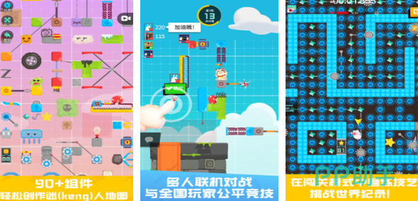 在马卡龙配色的卡通画质中,玩家拥有较高的自由度。组件的数量超过90种,涉及各种齿轮和云朵等小物件,玩家可进行自由组合。多人联机对战给予更多的刺激。玩家可利用组装好的枪支等武器进行正面对决。在个人的闯关模式中,玩家还可以挑战随机组合形成的地图,迷宫元素和追击元素带来更多的新鲜感。