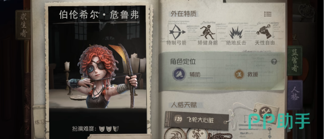 第一个外在特质“特质弓箭”,她随身携带特质木弓,点按或长按蓄力可对指定方向射出箭矢,蓄力时间越长,则射出弓箭距离越远,距离过远的情况下,则需要大家有一定的预判效果,如果是监管者被木箭命中,那么监管者10秒内会降低5%的移动速度,如果再次被命中,能缩短刷新时间,同时额外眩晕3秒。