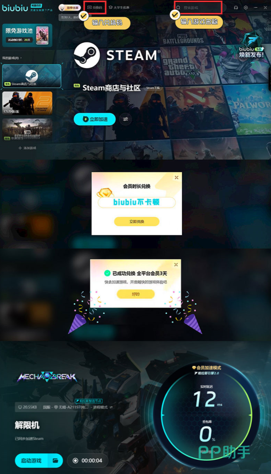 大家在体验剧情时,可以下载一个biubiu加速器来加速,现在新用户下载能享受3小时免提体验时长的活动,且无论新老用户都可用兑换码【biubiu不卡顿】额外再得3天免费时长。
