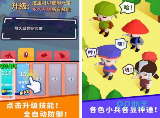 这款你能成为小冰展开拆家的游戏中,需要将最后一座城摧毁,虽然整个过程中,也会面临很多的阻碍,但是有趣的小兵,还是会在整个过程中发挥自己的实力。整体采用复古的画面,还有流畅的射击手感。在小兵来了的过程中,需要拿起弓箭进行防御,还能利用点击的升级技能,来进行全自动防御。每个小兵都有着不一样的设计风格以及神通。